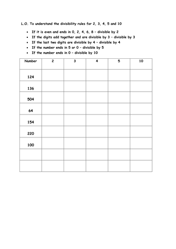 Free Divisibility Rules Worksheets & Teaching Resources | TpT Free Math Printable: Divisibility Rules for 2, 5 and 10 Number Sort (Grades 5-7) by Krystal Mills 17 FREE PDF This is a 2 page freebie (one worksheet and the solution) for some quick practice with the divisibility rules for 2, 5 and 10. I do have other, more in depth lessons on divisibility rules - just browse my store!