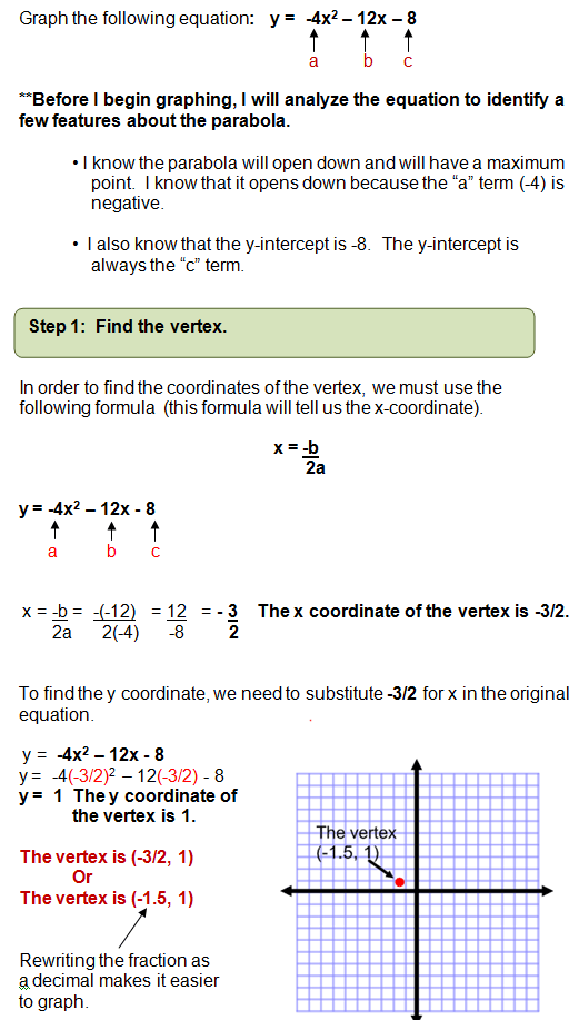 Graphing quadratic functions - Math Worksheet There are a few pieces of information that you have to put together in order to create a graph of a quadratic function. Before anything, though, we need to learn the standard form of a quadratic and this is it: a x 2 + b x + c a,b,and c are all numbers For example, what are a,b, and c in the following expression? 2 x 2 + 4 x − 3 a = 2 b = 4 c = -3